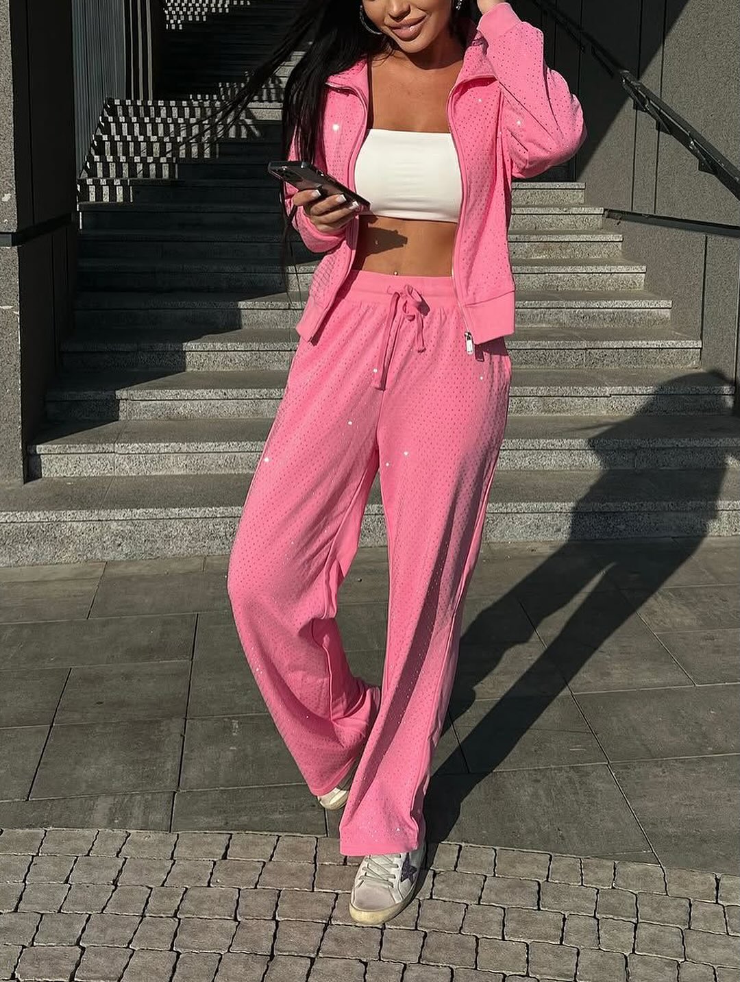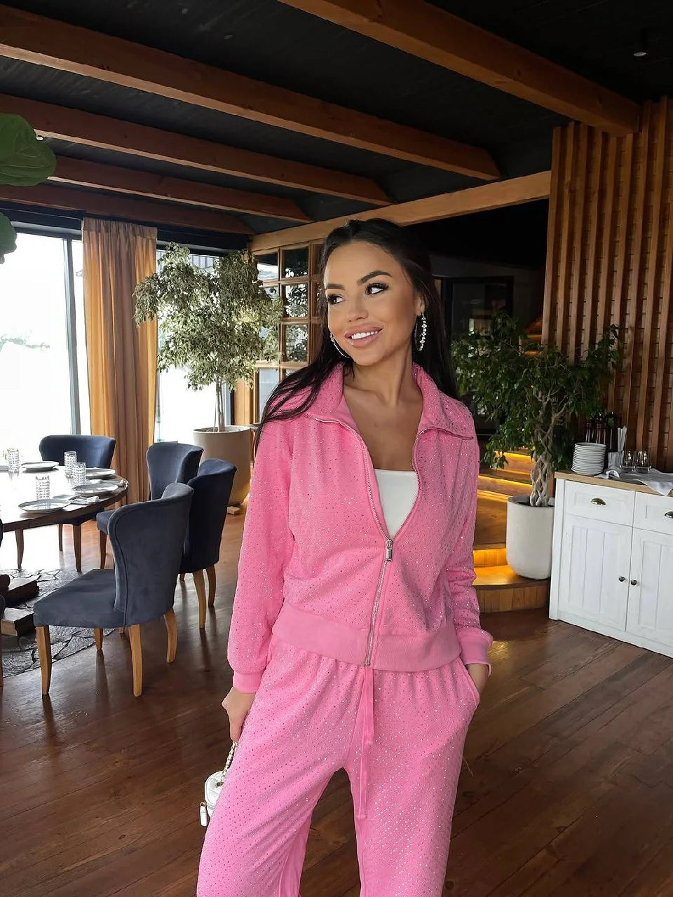 Zarafeti günlük stile taşımak isteyenler için tasarlanan Taşlı Eşofman Takım, modern spor şıklığını göz alıcı taş detaylarıyla bir araya getiriyor. Premium dokulu kumaşı sayesinde gün boyu maksimum rahatlık sunarken, ışığı stilinize yansıtan parlak taş işlemeleri ile dikkat çekici bir görünüm oluşturur.